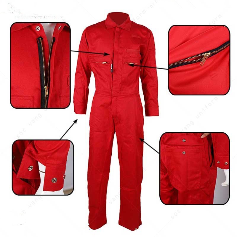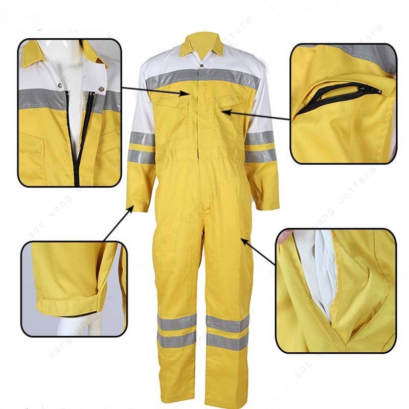 Thiết kế trang phục: Áo liền quần bảo hộ lao động cần được thiết kế đơn giản nhưng vẫn đảm bảo rộng rãi, thoáng mát và có khả năng co giãn tốt. Áo thường có 2 túi ở ngực và 2 túi ở sườn áo, cùng với 2 túi ngang ở đùi. Đối với áo bảo hộ lao động, đường chỉ may cần được chắc chắn, bền bỉ, đặc biệt là ở những phần áo phải chịu lực lớn. Nếu làm việc trong môi trường thiếu ánh sáng, cần xem xét việc thêm dải phản quang để tăng cường an toàn cho người lao động.