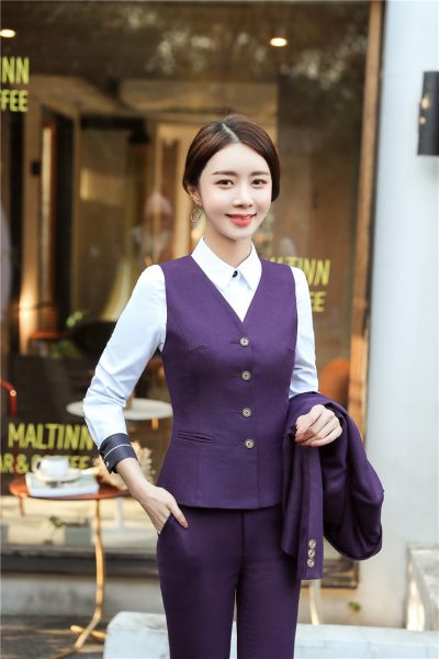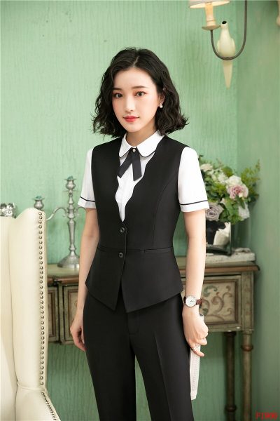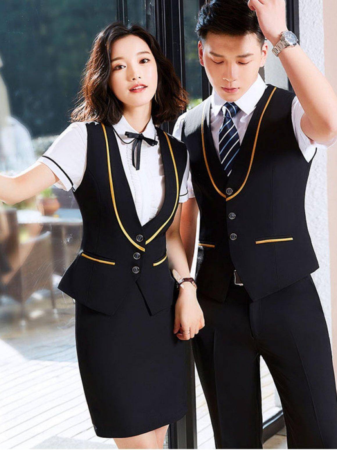 Áo gile Nhân viên lễ tân nhà hàng: Mix áo gile với chân váy bút chì giúp nhân viên lễ tân nhà hàng trông dịu dàng và duyên dáng. Áo gile còn có chiết eo giúp tôn lên vóc dáng của nhân viên nữ và mang lại ấn tượng tốt với khách hàng.