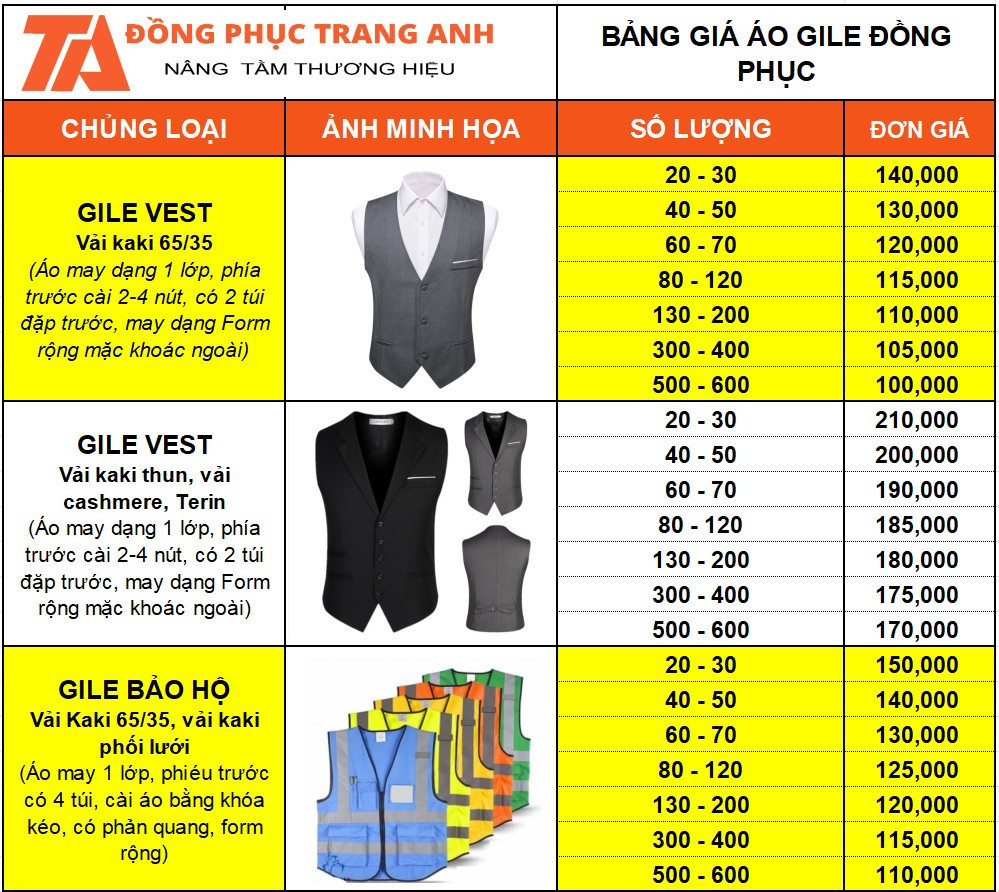 Quý khách đang có nhu cầu đặt may áo gile đồng phục theo yêu cầu tại Bình Dương, Đồng Nai, TPHCM. Xưởng may Trang Anh xin gửi đến quý khách hàng bảng giá may áo gile đồng phục mới nhất, áp dụng cho các mẫu của nhà hàng, khách sạn cao cấp 4 sao. Chúng tôi cam kết mức giá tại xưởng và không qua trung gian, mẫu áo hợp thời trang và chuyên nghiệp.