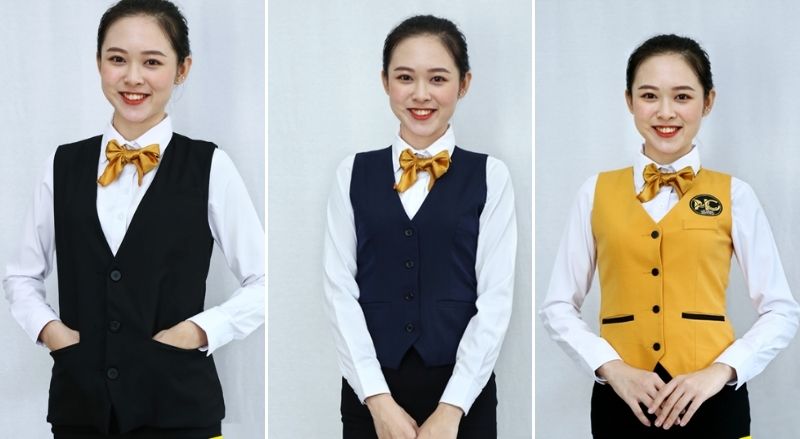 Áo gile Nhân viên phục vụ bàn: Nhân viên phục vụ bàn cần có hình ảnh chuyên nghiệp để tạo ấn tượng với khách hàng. Áo gile đồng phục thường sử dụng các màu cơ bản và kết hợp với áo sơ mi trắng để tạo vẻ ngoài chỉnh chu, đẳng cấp cho nhân viên.