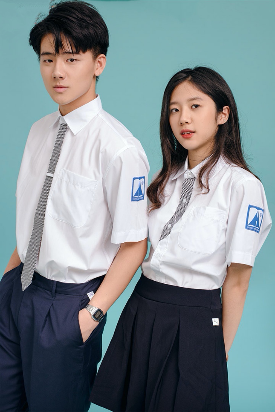 Đồng phục học sinh thường là áo sơ mi trắng được thiết kế kiểu dáng tuỳ vào từng trường nhưng đều được thêu logo của nhà trường lên phần bắp tay áo hoặc phần ngực.