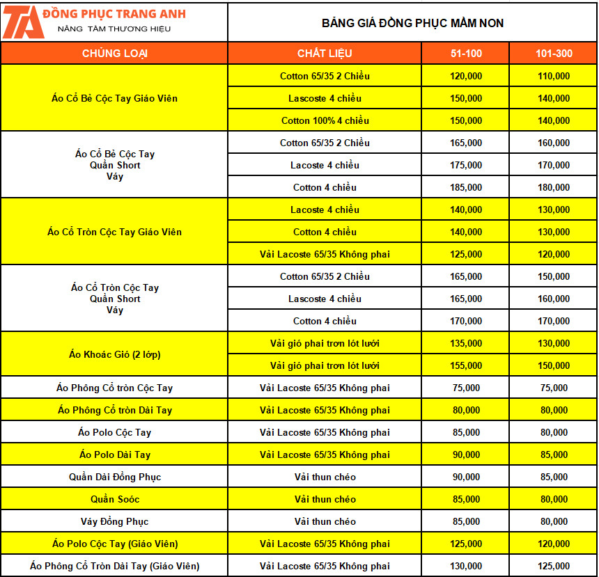 Ngoài đồng phục học sinh, Trang Anh Uniform còn cung cấp đồng phục cho nhiều lĩnh vực khác nhau như đồng phục áo thun, đồng phục công ty, bảo hộ lao động, công nhân, spa, nhà hàng, khách sạn và áo khoác đồng phục. Quý khách vui lòng truy cập website của chúng tôi để tìm hiểu thêm. Cảm ơn quý khách đã quan tâm đến Trang Anh Uniform.