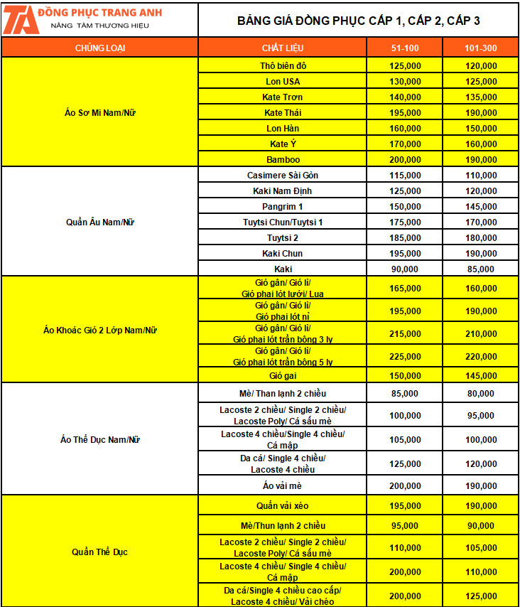 Bảng Giá đồng phục cấp 1, cấp 2, cấp 3